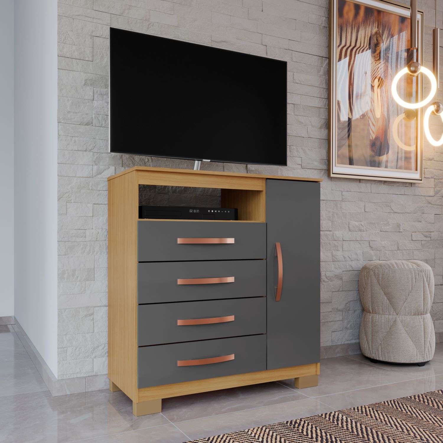 Cômoda Sapateira Cannes Carvalho Amer. Grafite Porta e Prateleira + 4 Gavetas